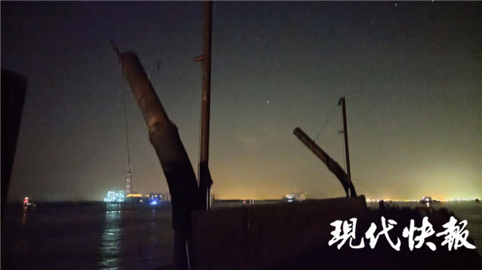 3月19日深夜,張彥龍想著“換換法子”,于是聯(lián)系了熟悉的漁民借來(lái)快艇,帶著3名大隊(duì)民警換了地點(diǎn)上船,再次開(kāi)展夜間巡航。1個(gè)多小時(shí)后,從世業(yè)洲小江水域繞到長(zhǎng)江119附近水域時(shí),張彥龍的眼睛突然亮了:夜幕下,一排大黑管子豎立在空中,不停向外吐出黑水,一艘采砂船與一艘運(yùn)砂船正在作案。