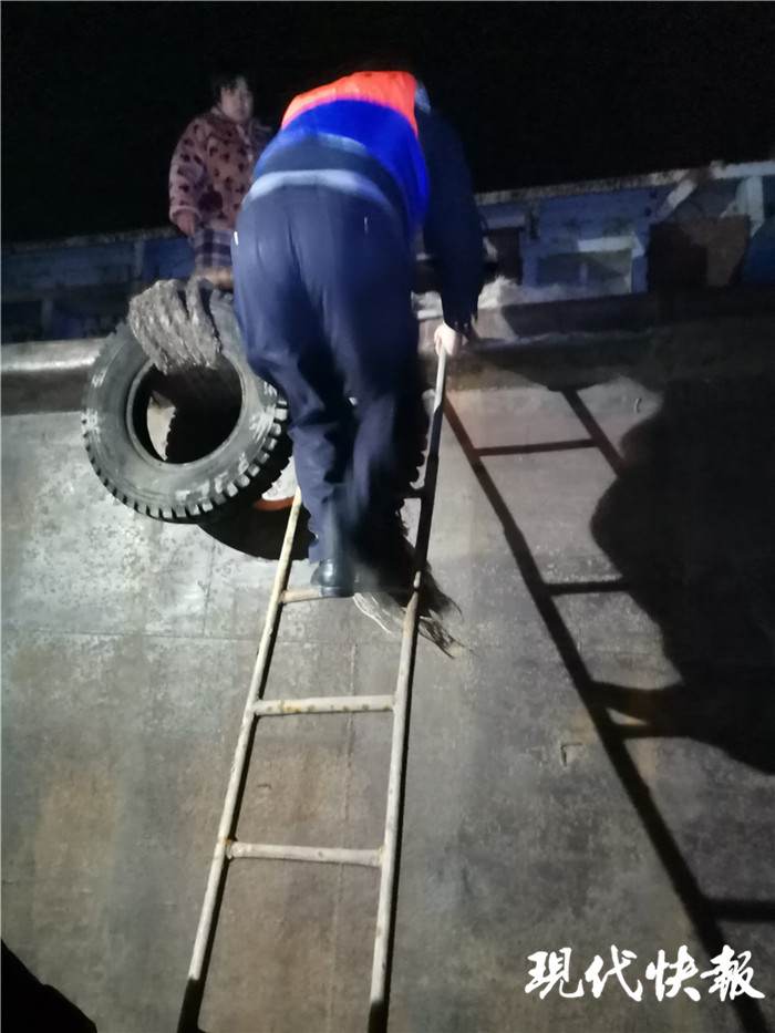 張彥龍一邊向指揮部匯報(bào)情況,一邊指揮快艇迅速靠近采砂船。大船和快艇有1米多的落差,他率領(lǐng)民警從大船側(cè)邊輪胎爬了上去。“我們是鎮(zhèn)江水警,所有人雙手抱頭蹲下,配合調(diào)查。”民警幾人登上船后,將4名采砂人員控制在駕駛室內(nèi)。