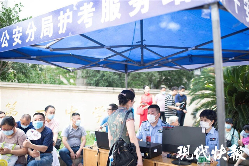 當天上午8點,現(xiàn)代快報記者在南京市第一中學門口看到民警正在對考生及送考家長進行有序引導。為全力做好護考工作,警方在每個考點均配備3名執(zhí)勤警力,同時安排1輛特警武裝巡邏車做好應(yīng)急處突工作。針對往常時有發(fā)生的考生忘帶身份證等突發(fā)事件,警方還在每個考點門前設(shè)置護考服務(wù)點,引入公安戶政辦理一攬子軟硬件系統(tǒng),現(xiàn)場安排行政審批辦證民警為考生服務(wù),僅需1分鐘就可以出具臨時身份證明,最大限度為“馬大哈”考生消除后顧之憂。