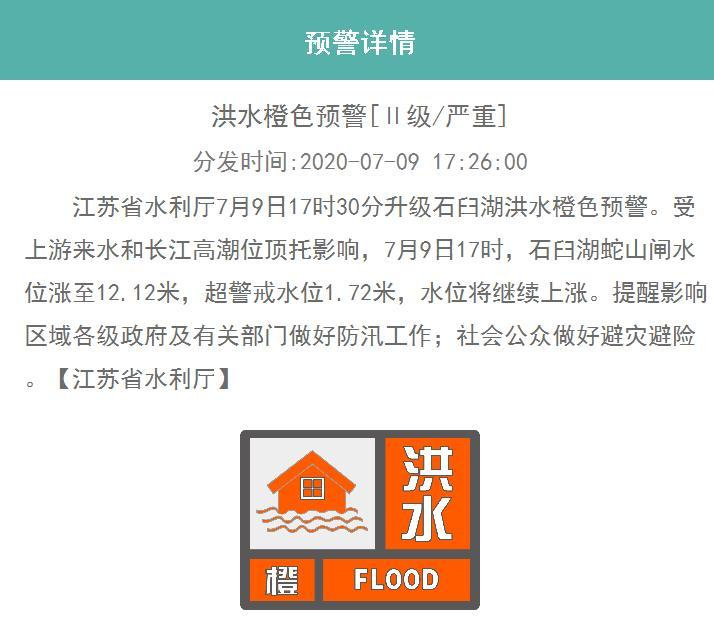 (記者 盧河燕)7月9日17時30分,江蘇省水利廳升級石臼湖洪水橙色預警?,F(xiàn)代快報記者注意到,7月5日23時,省水利廳曾發(fā)布石臼湖洪水藍色預警,并于7月8日21時升級為洪水黃色預警。