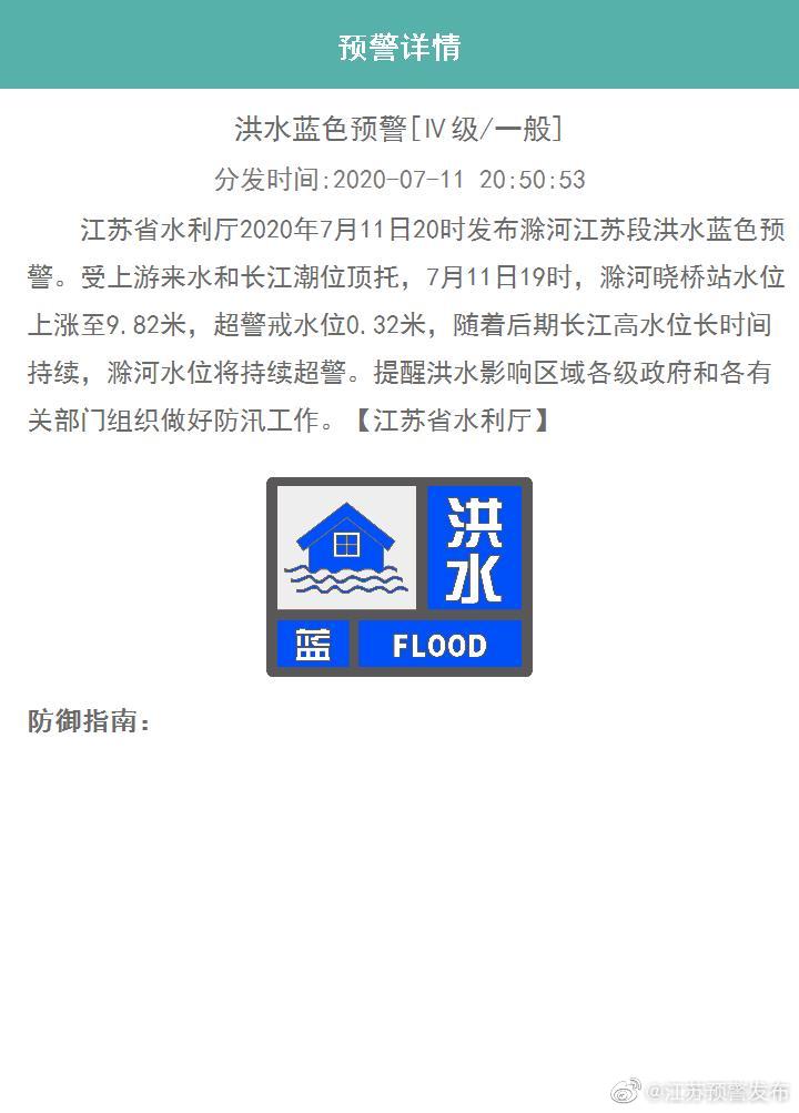 (記者 盧河燕)2020年7月11日20時(shí),江蘇省水利廳發(fā)布滁河江蘇段洪水藍(lán)色預(yù)警。