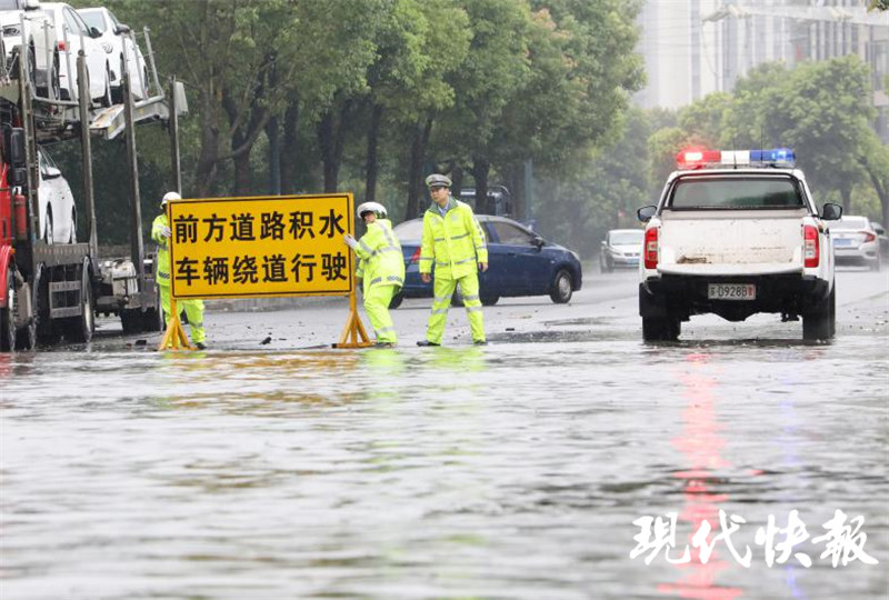 △道路積水嚴(yán)重,交警進(jìn)行道路引導(dǎo)