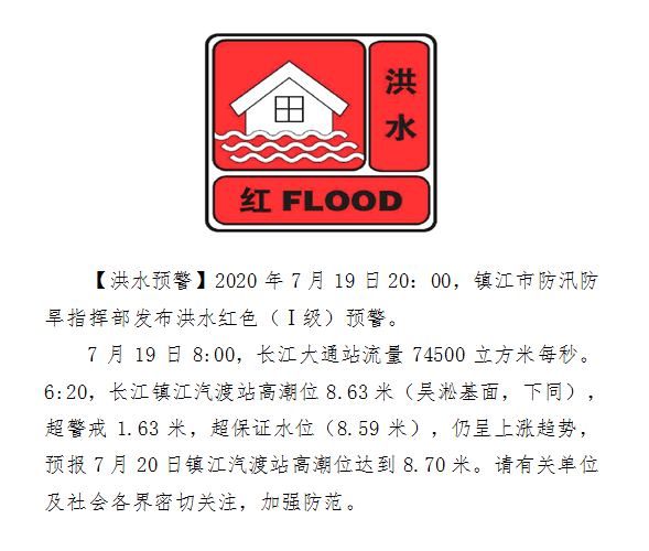 (通訊員 徐鵬飛 記者 曹德偉)7月19日晚8點(diǎn),鎮(zhèn)江市防汛防旱指揮部發(fā)布洪水紅色(Ⅰ級(jí))預(yù)警。