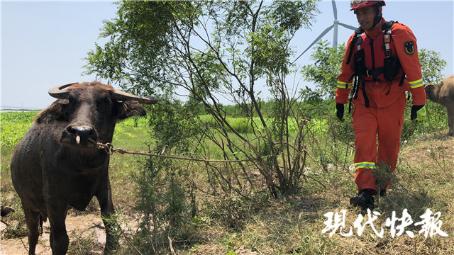 考慮到水位仍在上漲,河中還有兩頭沒有解開拴繩的水牛,若不及時(shí)解開拴繩,水??謺?huì)被上漲的河水淹死。隨后,消防指戰(zhàn)員又駕駛沖鋒舟,利用鐮刀將拴住兩頭水牛的繩子割斷,兩頭水牛安全地游上了岸。