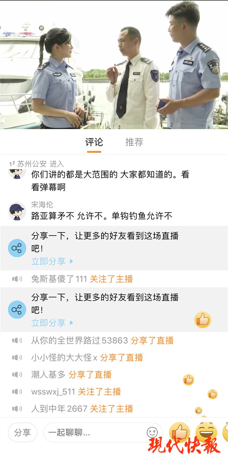 8月4日,江蘇省公安廳新聞宣傳中心、蘇州市公安局新聞宣傳中心聯(lián)合開啟直擊長江禁捕第一線直播。直播中請來了一名嘉賓,他就是蘇州市公安局水警支隊(duì)民警許冬。他為大家解答了相關(guān)政策法規(guī)、禁捕水域范圍、“三無船舶”查處等相關(guān)熱門問題。