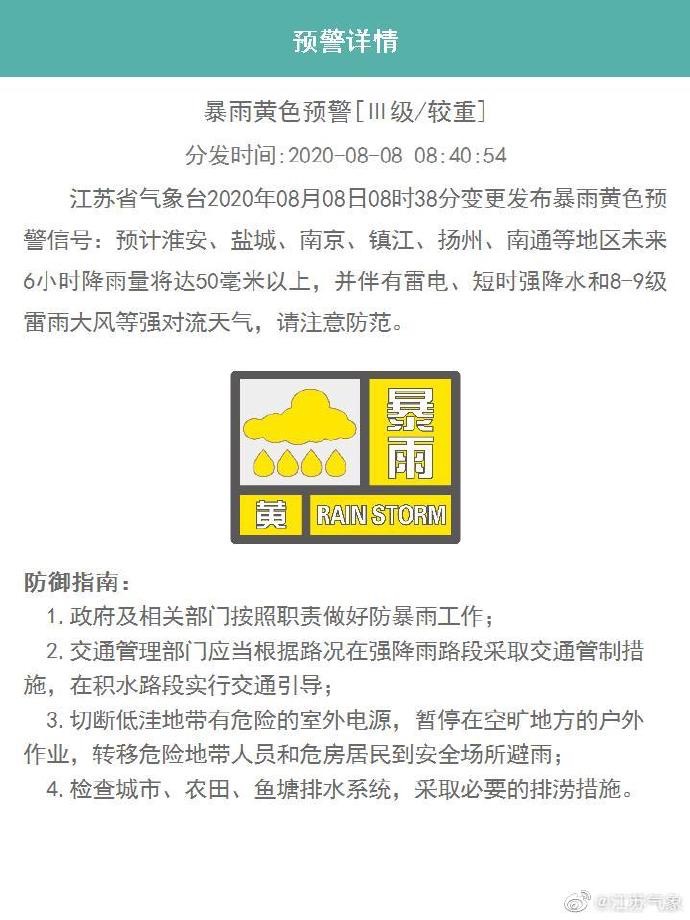 現(xiàn)代快報記者了解到,8月7日起至8月8日早晨,副高北側雨帶向南壓,強降雨主要出現(xiàn)在河南南部,安徽北部,江蘇北部一帶。隨后,江蘇沿江地區(qū)出現(xiàn)短時強降水、雷雨大風等對流天氣,浦口單小時雨量超50毫米!江蘇省氣象臺于8時38分變更發(fā)布暴雨黃色預警信號。預計淮安、鹽城、南京、鎮(zhèn)江、揚州、南通等地區(qū)未來6小時降雨量將達50毫米以上,并伴有雷電、短時強降水和8-9級雷雨大風等強對流天氣。淮安、南京、揚州、南通、蘇州等地也紛紛發(fā)布雷暴黃色預警,全省各地58條預警霸屏。