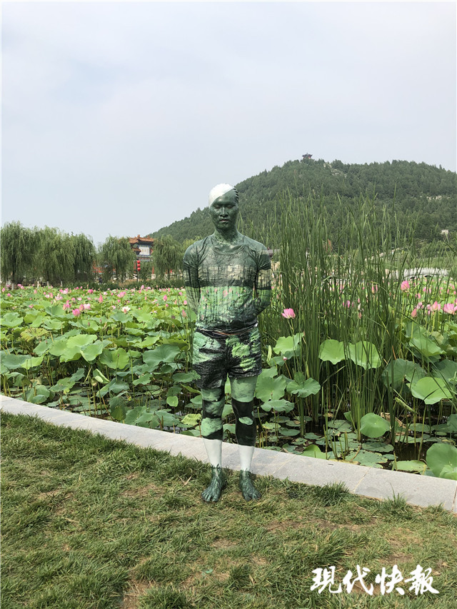 (記者 陸雨瀟)T恤、短褲、運動鞋,這是夏日里街頭常見的男士搭配,今年31歲的彩繪畫師王亮就經(jīng)常用這身穿搭,出入濟南周邊的各大景區(qū)。用丙烯顏料將大自然中的色彩繪遍全身、選擇合適角度、調(diào)整顏色構圖……一番操作下來,王亮仿佛電影里的“隱形人”一般,完美地融入自然。近日,王亮的“隱身”技能被網(wǎng)友們發(fā)現(xiàn),在他最近發(fā)布的一則自然彩繪視頻中,更是獲得了64萬點贊。“人體變色龍”“隱形人”,網(wǎng)友們用一連串只在小說和影視劇中聽過的詞語,來感嘆他高超的彩繪技巧。
