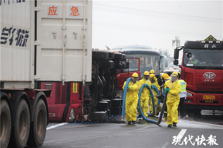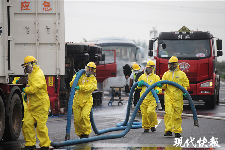 上午9點(diǎn),隨著現(xiàn)場(chǎng)總指揮的一聲令下,演練正式拉開帷幕。演練事故場(chǎng)景設(shè)定為,8:55在蘇皖交界往天長(zhǎng)方向K270+500處,一輛?;凡酃捃嚢l(fā)生側(cè)翻事故,引發(fā)后方大客車和貨車追尾,?;芬伤瓢l(fā)生泄露,現(xiàn)場(chǎng)半幅交通中斷且有人員受傷。接現(xiàn)場(chǎng)事故報(bào)告后,高速交警、交通執(zhí)法、高速公路經(jīng)營(yíng)管理單位等“一路多方”立即響應(yīng),第一時(shí)間按相關(guān)要求核實(shí)高速公路?;愤\(yùn)輸車交通事故信息,迅速啟動(dòng)《江蘇省高速公路重特大交通事故及?;肥鹿侍幹妙A(yù)案》和《高速公路省際聯(lián)動(dòng)協(xié)作機(jī)制》,并立即通知安徽和揚(yáng)州的應(yīng)急管理、環(huán)保、消防、通訊、急救、社會(huì)救援等“一路多方”前往現(xiàn)場(chǎng)開展救援。
