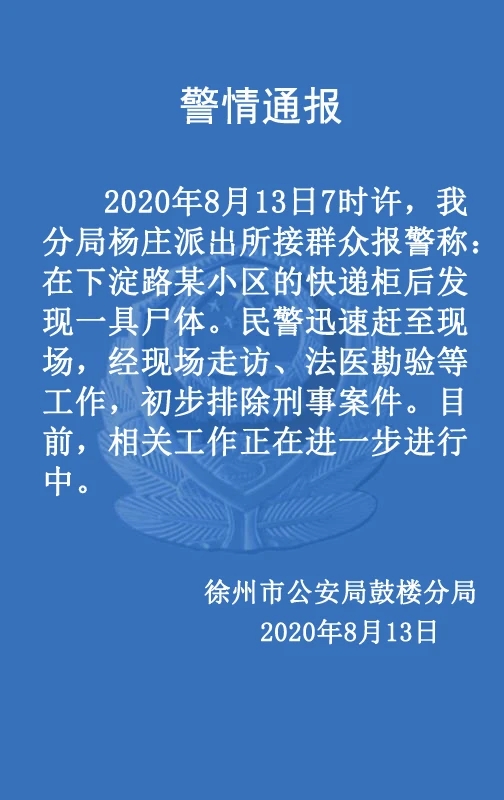(記者 張曉培)8月13日,徐州市公安局鼓樓分局發(fā)布警情通報(bào)稱,當(dāng)天早上7點(diǎn)多,楊莊派出所接群眾報(bào)警,在下淀路某小區(qū)的快遞柜后發(fā)現(xiàn)一具尸體。