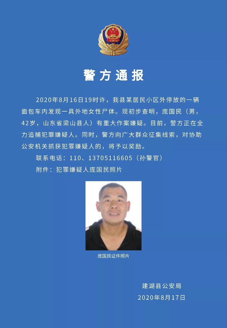 (記者 姜振軍)8月17日下午,鹽城市建湖縣公安局發(fā)布警方通報(bào)稱:2020年8月16日19時(shí)許,我縣某居民小區(qū)外停放的一輛面包車內(nèi),發(fā)現(xiàn)一具外地女性尸體。現(xiàn)初步查明,龐國民(男,42歲,山東省梁山縣人)有重大作案嫌疑。