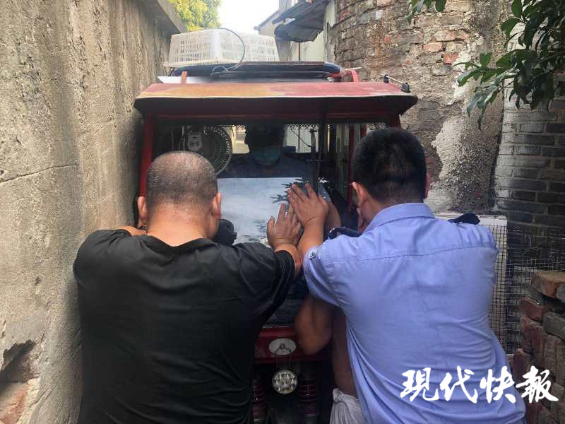 原來,老人是給人搬家送貨的,當時想從這邊的巷子里抄近路,剛開進巷子時,老人也發(fā)現路太窄了,但因趕時間,想著沖一沖就過去了,結果開到巷子中間卡住了,進退兩難,人也沒法出來。