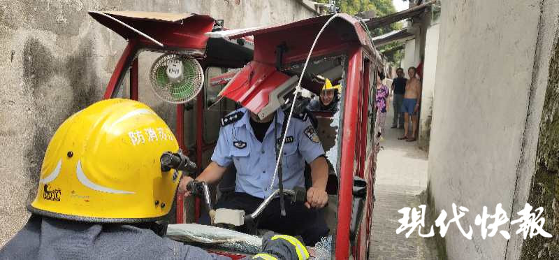 (通訊員 顧文婷 記者 毛曉華)為了抄近道,泰州一六旬老人開著電三輪進入一窄巷,結果開到一半時被卡在了巷子中進退不得,老人也被困在車內?,F代快報記者獲悉,接到求助后,公安、消防先后前來解救,因氣溫較高,老人被困2個多小時出現中暑癥狀,為安全最后只好將電三輪拆解后將老人救出。