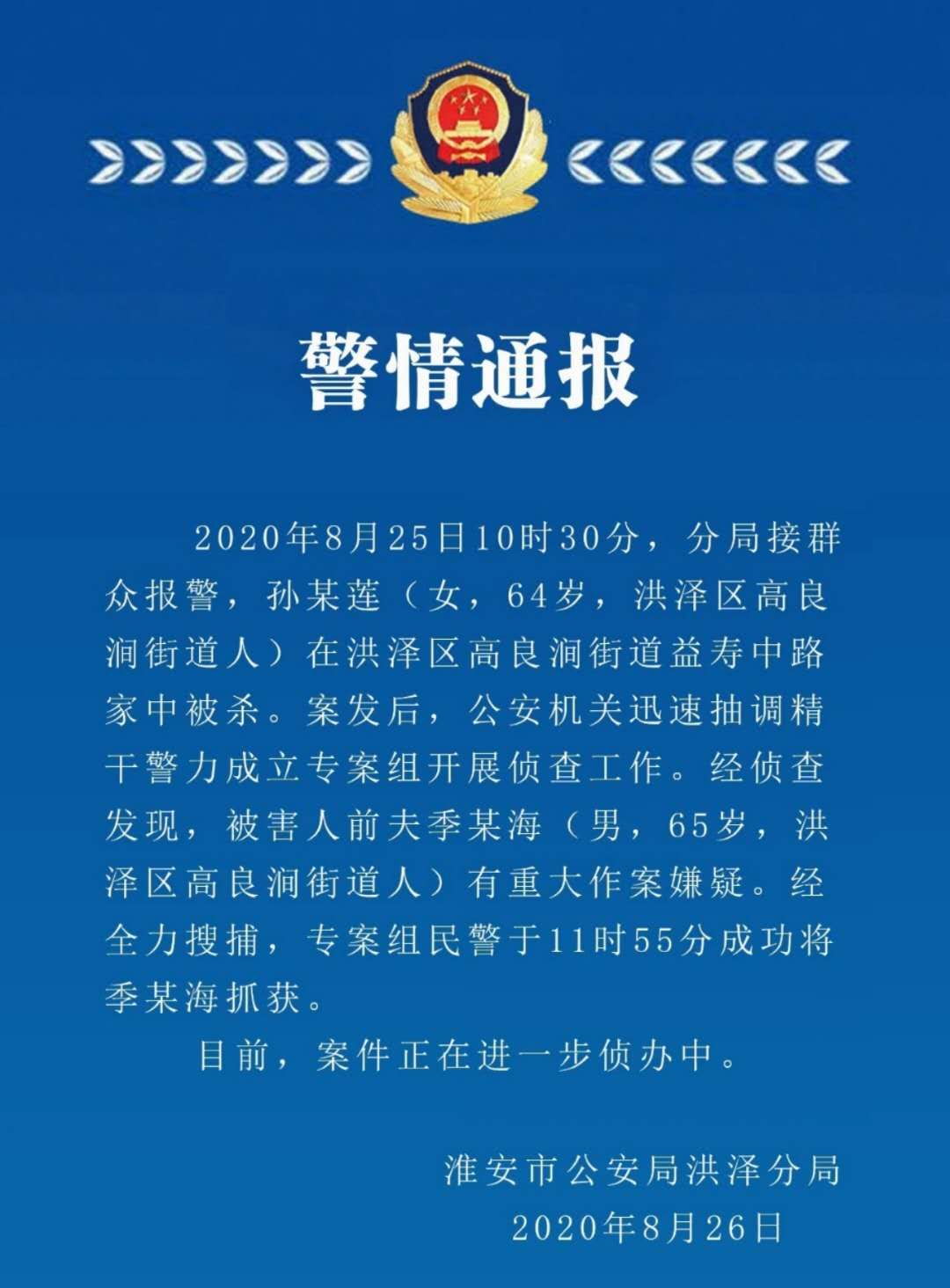 (記者 李子璇)8月26日,淮安市公安局洪澤分局發(fā)布警情通報,25日接群眾報警稱,孫某蓮(女, 64歲,洪澤區(qū)高良澗街道人)在淮安市洪澤區(qū)高良澗街道益壽中路家中被殺。