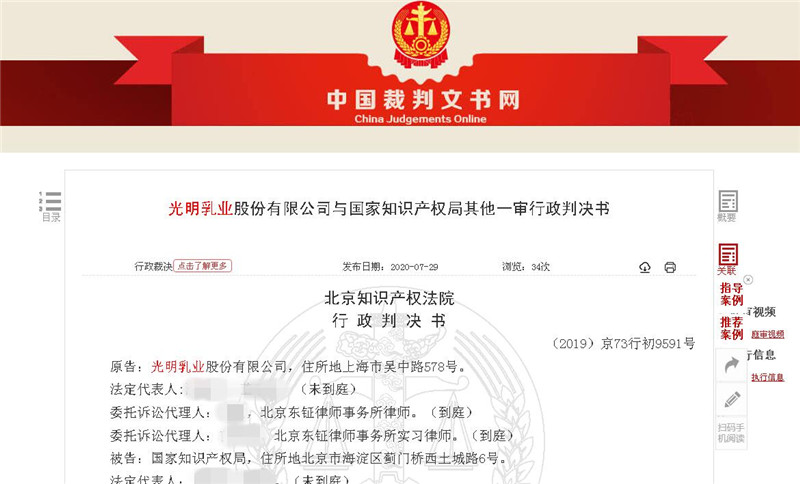 2019年8月,光明乳業(yè)不服此裁定,一氣之下將國(guó)家知識(shí)產(chǎn)權(quán)局告上法庭,請(qǐng)求北京知識(shí)產(chǎn)權(quán)法院依法撤銷裁定,并判令國(guó)家知識(shí)產(chǎn)權(quán)局重新作出裁定。