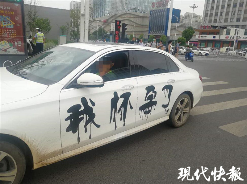 當(dāng)天上午,徐州云龍交警大隊(duì)五中隊(duì)民警在慶豐路與和平路交叉口執(zhí)勤期間,發(fā)現(xiàn)一輛白色奔馳車(chē)上赫然貼著“渣男”“我懷孕了”幾個(gè)大字。白車(chē)配上黑色大字,十分顯眼。隨即,民警讓其靠邊停車(chē)接受檢查。