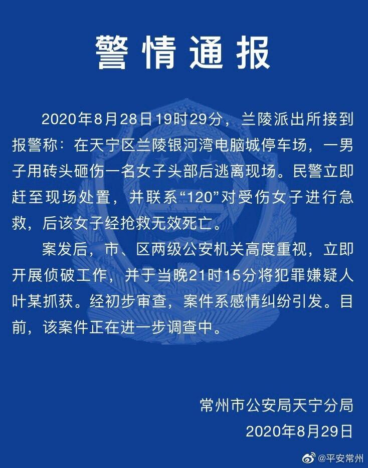 通報稱:8月28日19時29分,蘭陵派出所接到報警稱:在天寧區(qū)蘭陵銀河灣電腦城停車場,一男子用磚頭砸傷一名女子頭部后逃離現場。民警立即趕至現場處置,并聯系“120”對受傷女子進行急救,后該女子經搶救無效死亡。案發(fā)后,常州市、區(qū)兩級公安機關高度重視,立即開展偵破工作,并于當晚21時15分將犯罪嫌疑人葉某抓獲。