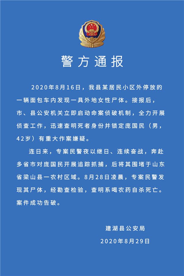 (記者 姜振軍)8月29日傍晚6時許,鹽城市建湖縣公安局發(fā)布警方通報稱,2020年8月16日,我縣某居民小區(qū)外停放的一輛面包車內(nèi)發(fā)現(xiàn)一具外地女性尸體。接報后,市、縣公安機關(guān)立即啟動命案偵破機制,全力開展偵查工作,迅速查明死者身份并鎖定龐國民(男,42歲)有重大作案嫌疑。