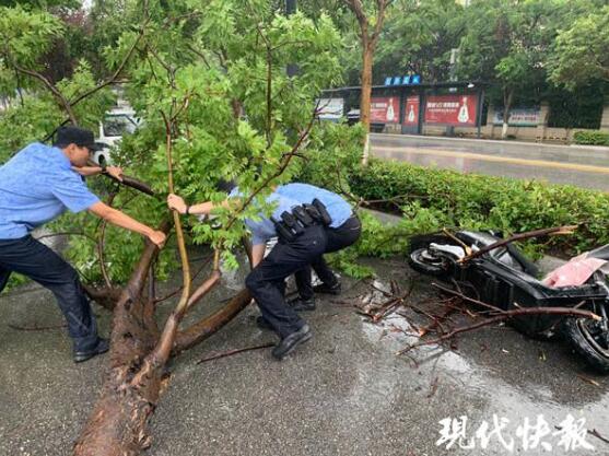 民警陳大偉立即與同事趕到現(xiàn)場進行處置。幸運的是兩名群眾僅為擦傷,并無大礙,陳大偉幫助他們進行了簡單的包扎。" 可這棵大樹整個樹干、樹冠將非機動車道覆蓋了,已經(jīng)完全沒有辦法通行,一輛電動自行車還壓在樹下面,阻礙了交通。" 陳大偉告訴現(xiàn)代快報記者。