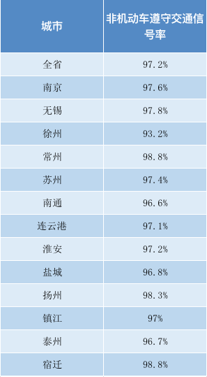全省各地非機動車遵守交通信號燈率平均值為97.2%,常州、揚州、宿遷等地非機動車遵守交通信號率均超過98%。