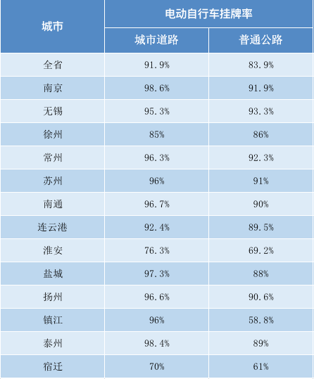 全省城市路口電動自行車掛牌率平均值為91.9%,其中南京最高為98.6%;全省國省道普通公路電動自行車掛牌率平均值為83.9%,其中無錫最高為93.3%。