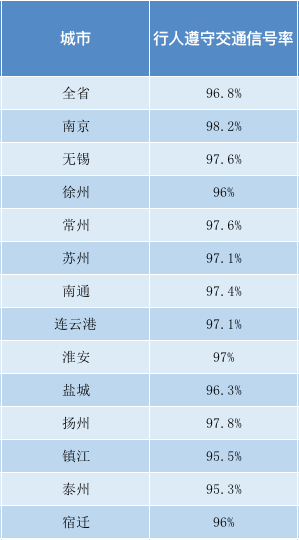 全省各地行人遵守交通信號率平均值為96.8%,南京、無錫、常州、蘇州、南通、連云港、淮安、揚州等地行人遵守交通信號率均超過97%。