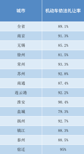 全省各地機動車依法禮讓率平均值為89.1%,南京、常州、蘇州、連云港、淮安、揚州、宿遷等地機動車依法禮讓率均超過90%。