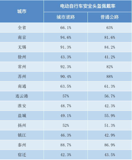 全省城市路口電動自行車駕乘人員頭盔佩戴率平均值為66.1%,其中南京最高為94.6%;全省國省道普通公路電動自行車駕乘人員頭盔佩戴率平均值為63%,其中蘇州最高為88%。