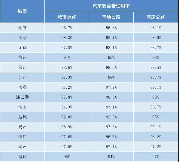 全省城市道路駕乘人員安全帶佩戴率平均值為96.7%,其中揚州最高為98.9%;普通公路駕乘人員安全帶佩戴率平均值為96.6%,其中南京最高為98.7%;高速公路駕乘人員安全帶佩戴率平均值為98.1%,其中常州最高為99.5%。