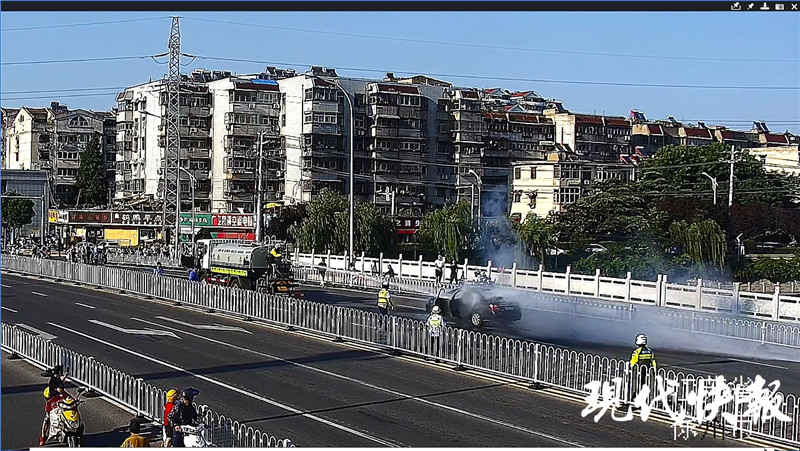 此時,明火已經(jīng)在車頭開始燃燒。正在蘇堤北路巡邏的徐州交警泉山大隊四中隊輔警杜策發(fā)現(xiàn)了橋上的火情,立即通過對講機請求支援,并向附近的城管崗?fù)ふ埱髤f(xié)助,與銅沛辦事處的城管隊員們一起拿著滅火器趕到車旁開始滅火。