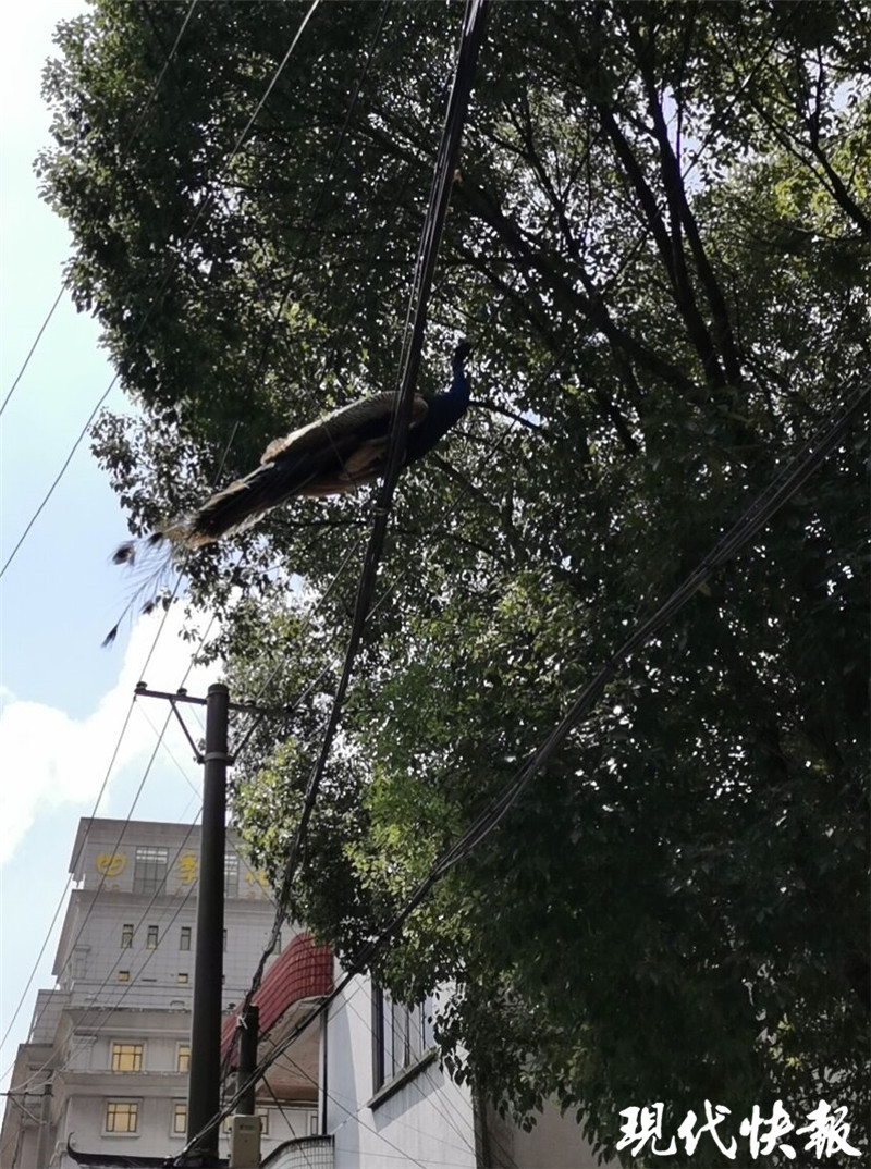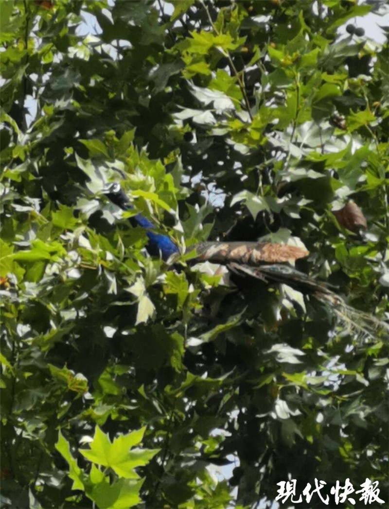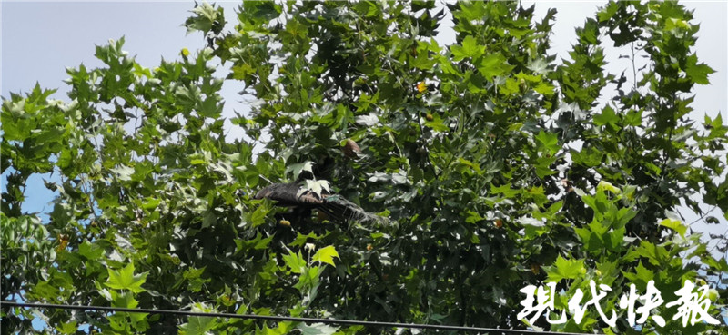9月1日,常熟市公安局興福派出所接群眾報警稱,黃河路郵政小公園一棵梧桐樹上立著一只孔雀。接到報警后,派出所一面聯(lián)系常熟市消防大隊黃河路中隊尋求幫助,一面安排民警攜帶抓捕裝備前往現(xiàn)場。現(xiàn)場,許多群眾正在圍觀,民警在報警人的指引下見到了這只迷途的孔雀。只見它泰然自若立在離地約6米高的梧桐樹樹冠上,正悠閑地享受著傍晚的涼風(fēng)。