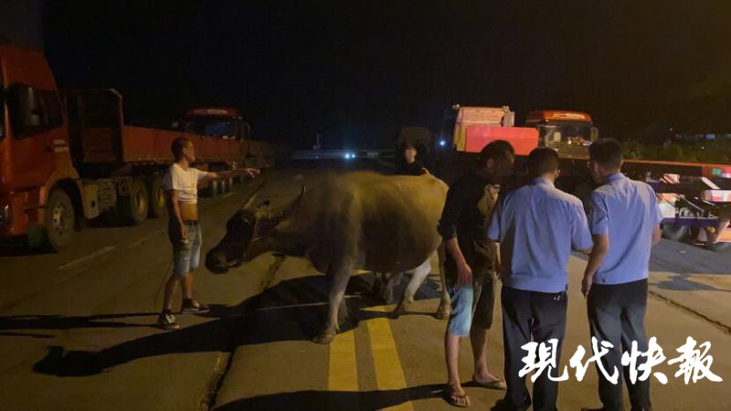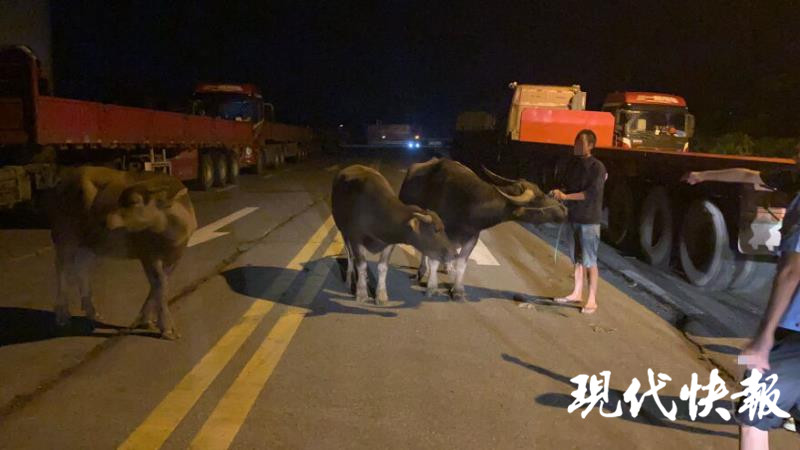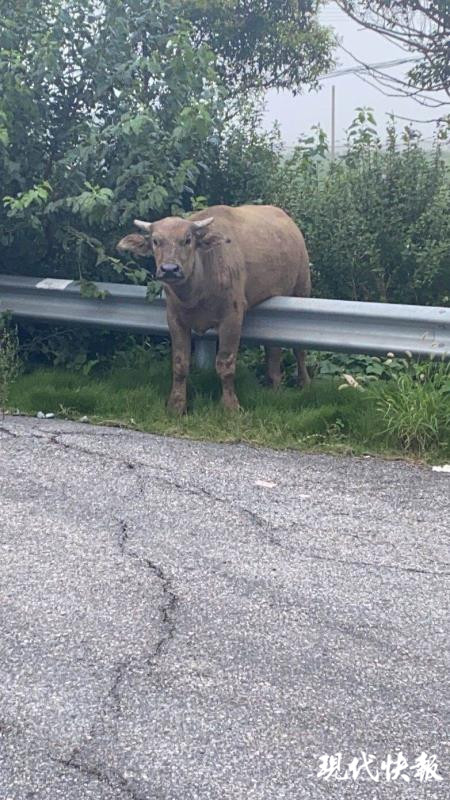 水牛組團(tuán)跑上國道 其中一頭“跨欄”被卡