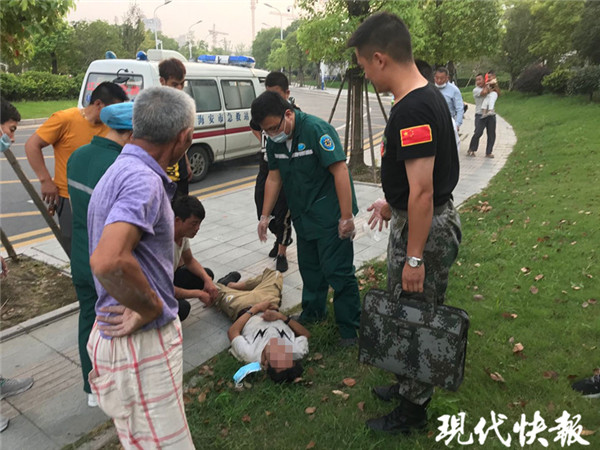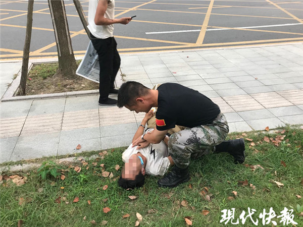 9月9日下午,海安市海安街道新橋社區(qū)民兵營(yíng)營(yíng)長(zhǎng)于愛榮,駕車送剛從海安征兵辦審?fù)晷卤鴻n案的宋超前往火車站。宋超剛下車,就發(fā)現(xiàn)站臺(tái)門前的草坪上,一名小伙在地上打滾,渾身抽搐,旁邊的兩名市民急得不知所措。聽到求救聲,顧不得多想,宋超本能沖了過去,用急救技能立即對(duì)小伙展開救治,于愛榮則連忙撥打急救電話。