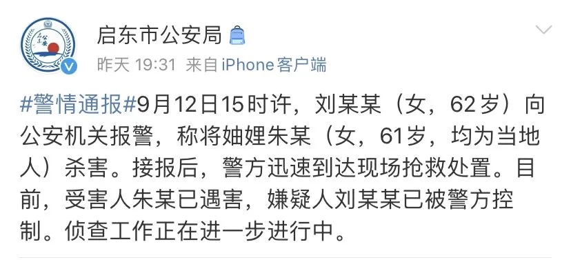 (記者 嚴(yán)君臣)9月12日晚,啟東市公安局通過(guò)官方微博發(fā)布一起警情通報(bào)。通報(bào)內(nèi)容顯示,9月12日15時(shí)許,劉某某(女,62歲)向公安機(jī)關(guān)報(bào)警,稱(chēng)將妯娌朱某(女,61歲,均為當(dāng)?shù)厝?殺害。接報(bào)后,警方迅速到達(dá)現(xiàn)場(chǎng)搶救處置。