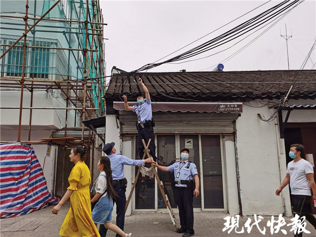 為了盡快幫助附近居民恢復(fù)路面情況,徐子能靈機(jī)一動(dòng),向附近正在維修房屋的居民借了長梯,在兩名輔警的幫助下,將垂落的電纜又掛回了高處。至此,北浩弄又恢復(fù)了暢通。