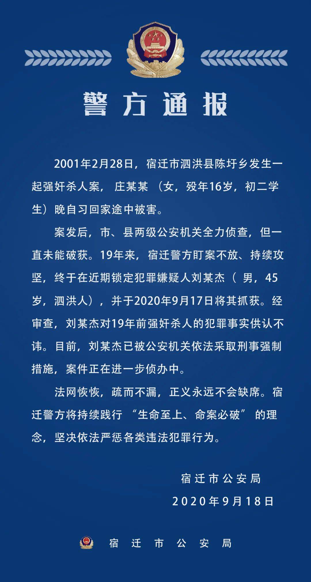 受害人遇害時年僅16歲。據(jù)通報顯示,2001年2月8日,宿遷市泗洪縣陳圩鄉(xiāng)一個16歲的初二女生莊某某在晚自習回家途中,遭到強奸,并遇害。案發(fā)后,市縣兩級公安機關一直在全力偵查,最終在近日鎖定了一名男子劉某杰(45歲,泗洪人)警方于9月17日將劉某杰抓獲后,他對19年前強奸殺人的犯罪事實供認不諱。