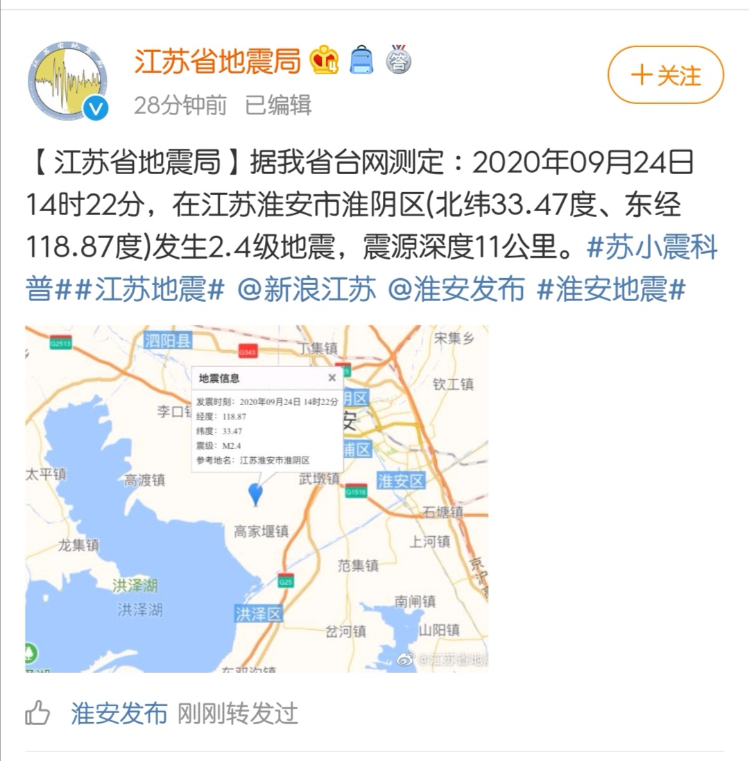 就在38分鐘前,24日14時22分,在江蘇淮安市淮陰區(qū)(北緯33.47度、東經(jīng)118.87度)發(fā)生2.4級地震,震源深度11公里,不少身處淮陰區(qū)的網(wǎng)友評論稱有震感。 (圖片來自微博截圖)