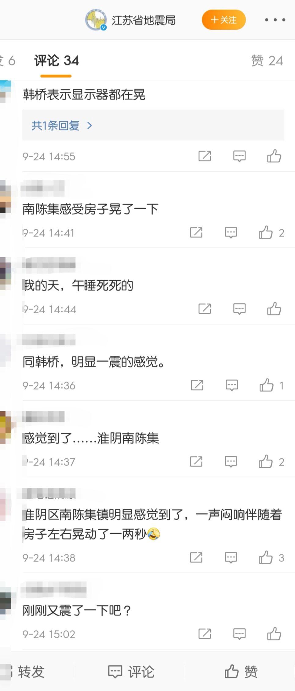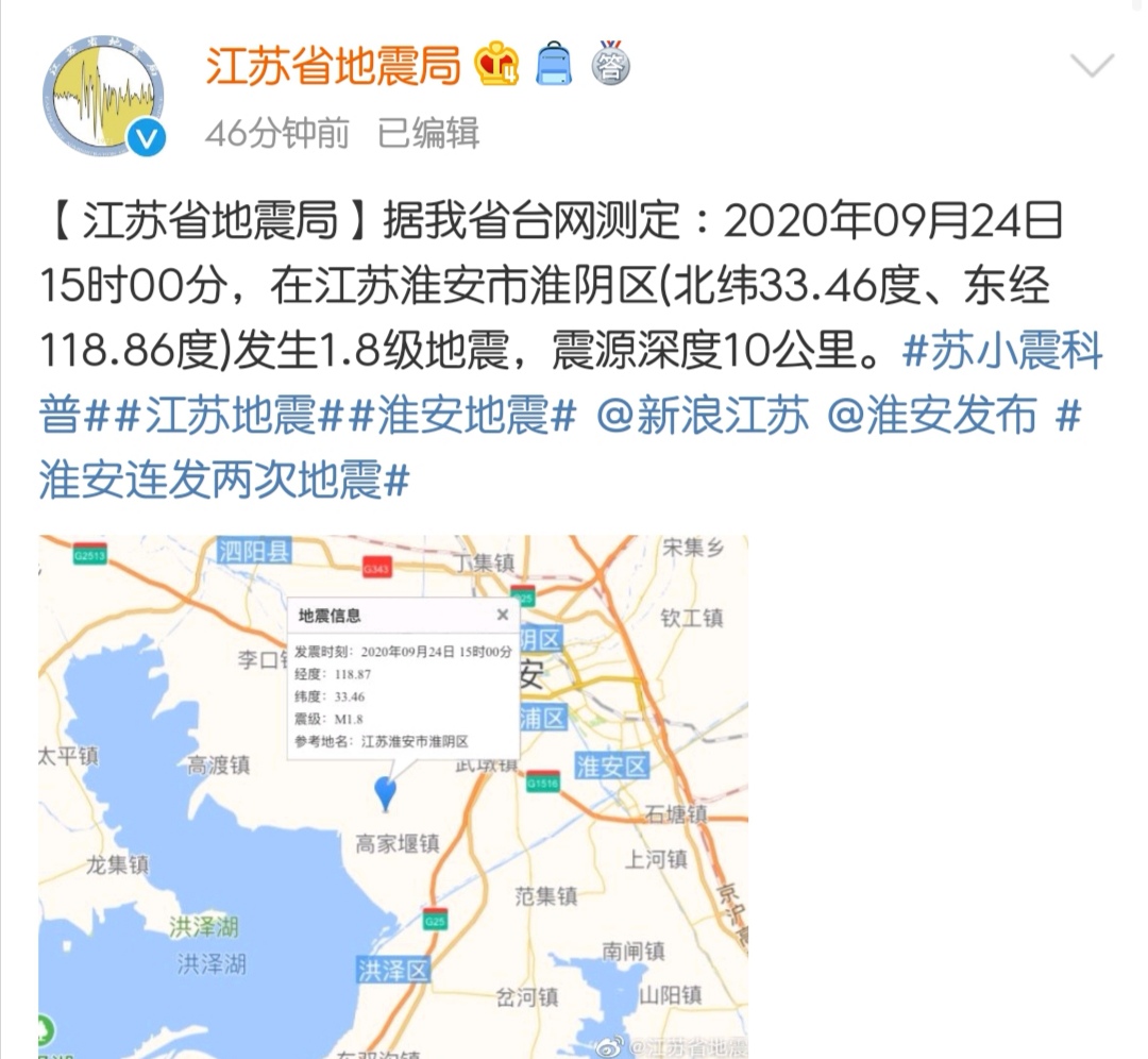淮安38分鐘連發(fā)2次地震 不少人稱有震感