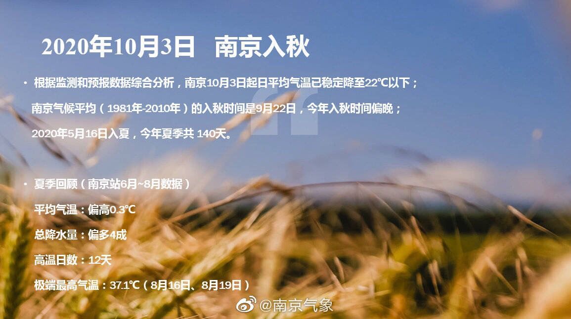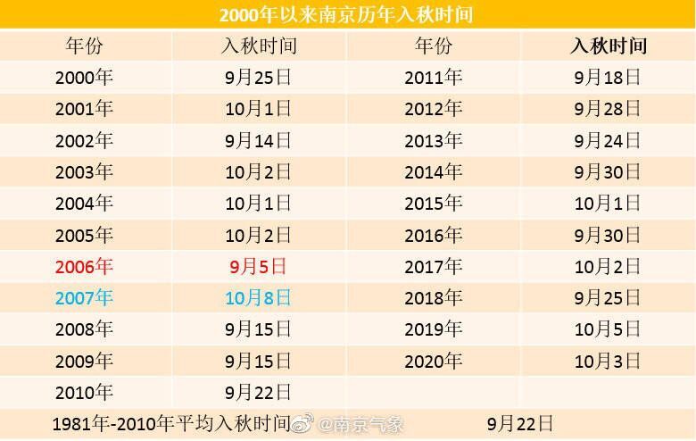 根據(jù)監(jiān)測(cè)和預(yù)報(bào)數(shù)據(jù)綜合分析,南京10月3日起日平均氣溫已穩(wěn)定降至22℃以下,于3日正式入秋。從往年看,南京氣候平均(1981年到2010年)的入秋時(shí)間是9月22日,今年入秋時(shí)間偏晚。2000年以來(lái),南京最晚入秋時(shí)間出現(xiàn)在2007年10月8日,最早為2006年9月5日。今年是本世紀(jì)入秋第三晚。