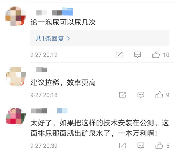 該馬桶吸引了許多人的眼球,網(wǎng)友們的評論也是腦洞大開:“祝宇航員們?nèi)鐜淇?”“我們不生產(chǎn)水,我們是尿液的搬運工。”“昨天的咖啡變成了明天的咖啡。”甚至有網(wǎng)友提議,地球上也盡快用起這款“了不起”的馬桶:“如果把這款馬桶安裝在公廁,這邊排尿,那邊就出礦泉水了,一本萬利啊。”