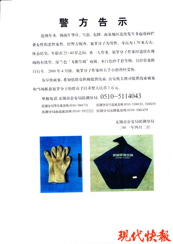 (見(jiàn)習(xí)記者 尤力庭)1999年至2001年,無(wú)錫錫南地區(qū)發(fā)生攔路襲擊單身女性系列案件,犯罪分子尾隨、守候夜間上下班女工,持棍棒、鐵錘等兇器攔路襲擊并實(shí)施搶劫、強(qiáng)奸,致2人死亡、多人受傷。限于當(dāng)時(shí)的條件限制,案件偵查始終未取得突破。