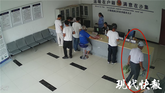 △老人拎著自己種植的瓜果蔬菜 來到派出所