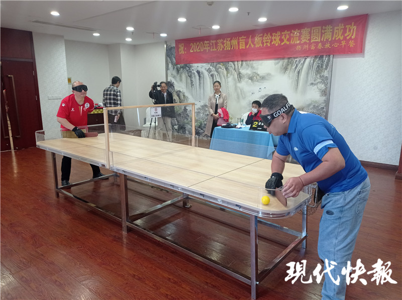 現(xiàn)代快報(bào)記者發(fā)現(xiàn),盲人板鈴球和桌上足球有些相似,不同的是,按照規(guī)定,參賽選手還需要帶上眼罩,完全依靠小球發(fā)出的聲音來辨別位置。