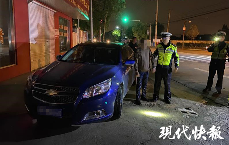 現(xiàn)代快報記者了解到,10月16日晚上8點,泰州靖江市公安局交警大隊斜橋中隊在友誼路與東阜路路口夜查酒駕。期間,一輛藍色轎車在距離檢查點50米處時走走停停,行動異常。