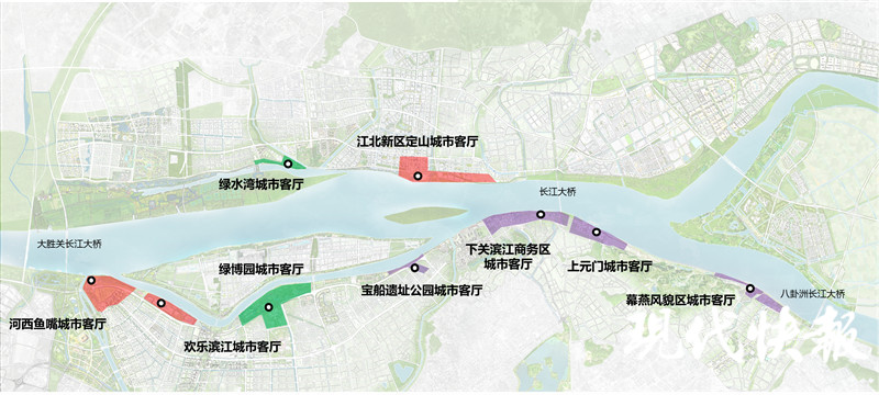 今年,《南京魅力濱江2035》出爐,提出要打造9大濱江城市客廳,如今這些客廳建設進展如何?南京市規(guī)劃和自然資源局城市設計處吳欣鑫介紹,南京的九大客廳各有定位。河西魚嘴城市客廳:將“青春揚子江”與江豚主題相結合,建設江豚互動廣場和活力運動水岸,打造南京國際形象和生態(tài)文明相融合的重要窗口。歡樂濱江城市客廳:打造集觀景、演出、休閑、游憩等多功能的濱江活動廣場,是交流和娛樂的歡樂舞臺。綠博園城市客廳:以綠博園為生態(tài)背景,強化河西文體軸與濱江的聯(lián)系,與江蘇大劇院聯(lián)動打造生態(tài)、綠色、活力的時尚文化客廳。寶船遺址公園客廳:集合寶船文化遺產(chǎn)、濱江公園、渡江勝利紀念碑和紀念館資源,打造國家級航海文化和紅色文化展示平臺。下關濱江商務區(qū)客廳:強調對近代歷史記憶的表達,建設近1公里的二層平臺,連接中山碼頭、大馬路、老江口等文化遺產(chǎn),重現(xiàn)20世紀初下關商埠風貌。上元門城市客廳:挖掘達摩“一葦渡江”的傳說和金陵船廠工業(yè)遺產(chǎn),形成歷史特色鮮明的創(chuàng)意園區(qū)。幕燕城市客廳:重現(xiàn)“燕磯夕照、永濟江流”等金陵經(jīng)典盛景,依托山水人文資源,打造宜居宜游的城市客廳典范。江北新區(qū)定山城市客廳:依托江北核心區(qū)資源,建設形成新區(qū)最重要的新城門戶、智慧客廳。綠水灣城市客廳:結合江北青奧體育公園,打造縱覽大江景色的濕地游園和弘揚青奧精神的生態(tài)客廳。