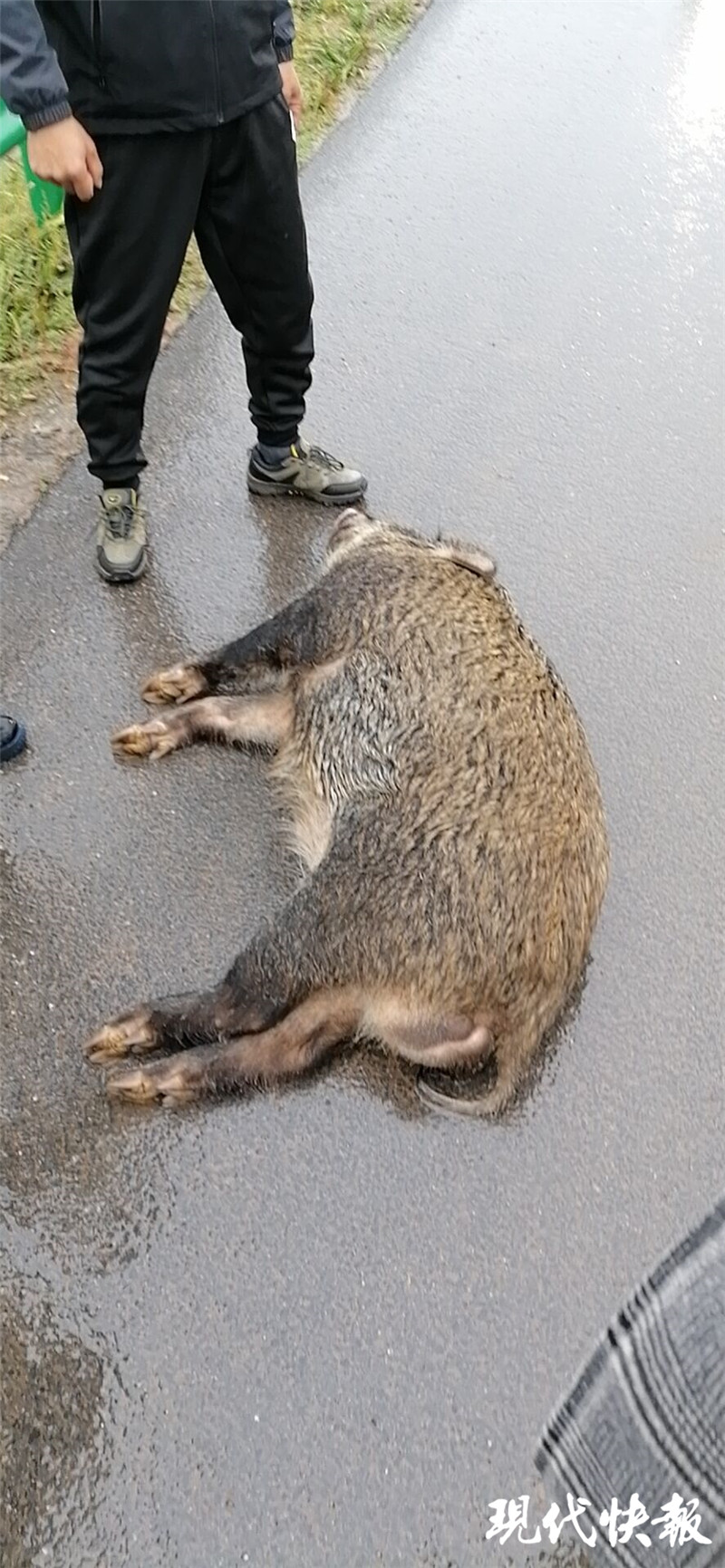 (通訊員 趙峰 楊志國(guó) 記者 曹德偉)11月21日下午1點(diǎn)半鐘左右,在鎮(zhèn)江句容固江口水庫南200米附近,一頭約200斤的野豬突然從馬路西邊竄出,與一輛正常行駛的寶馬車相撞。野豬當(dāng)場(chǎng)死亡,寶馬車輪胎稍微被撞偏,所幸并未造成人員受傷。