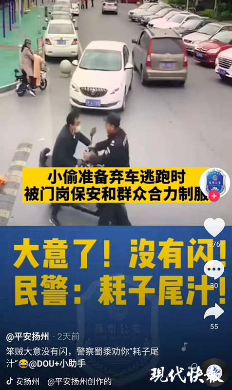 (通訊員 王晨煒 見(jiàn)習(xí)記者 莊劍翔)近日,揚(yáng)州警方抖音號(hào)“平安揚(yáng)州“發(fā)布的一段視頻戳中了網(wǎng)民們的笑點(diǎn)。視頻中,一名偷電動(dòng)車電瓶得手的小偷在逃跑出小區(qū)途中撞上小區(qū)出入口的攔道器摔了下來(lái)。小偷爬起來(lái)后還想騎著車“開(kāi)溜”,最終在棄車逃跑的過(guò)程中被一舉拿下。視頻配字:”大意了,沒(méi)有閃!民警:耗子尾汁“。11月22日,揚(yáng)州公安局邗江分局公布了這一案情。