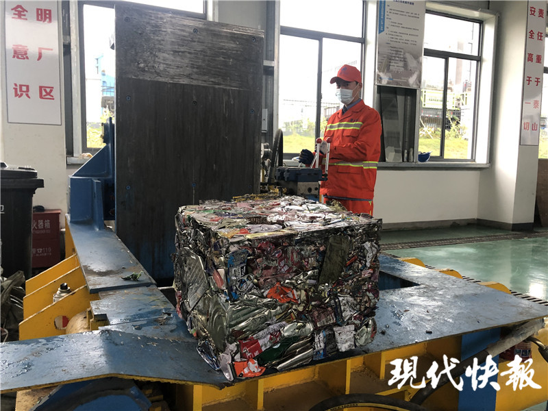 23日,在溧水區(qū)居民生活物品分揀(貯存)中心,工人正在對(duì)各類可回收物進(jìn)行分揀處理。只見工人將長(zhǎng)條的廢舊鋼管切成小段,并和易拉罐等其他金屬可回收物,放入一旁的壓縮機(jī)中。不到10分鐘,各類金屬都被壓成一塊立方體。而大件垃圾也在此進(jìn)行拆解分揀、分類貯存、分類處置。