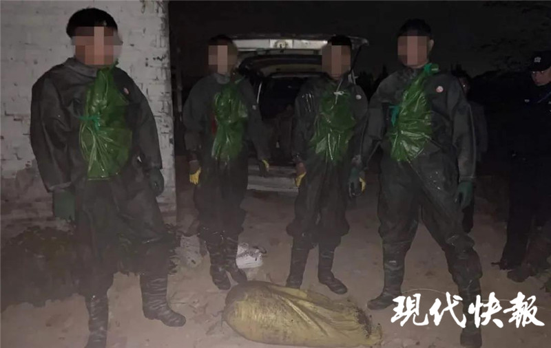 此時正值凌晨,一位看管魚塘的老人告訴民警,在前面的魚塘有四個人在偷螺螄。民警悄悄觀察后發(fā)現(xiàn),四個穿著熒光綠水產(chǎn)捕撈服的人,張開半米左右的三角形網(wǎng),正在魚塘里偷螺螄。確認情況后,民警迅速出動,一舉將四人抓獲。
