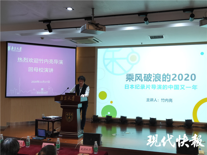 (記者 邱驊悅 文/攝)11月27日上午,拍攝了《南京抗疫現(xiàn)場》《好久不見,武漢》等專題紀(jì)錄片的日本導(dǎo)演竹內(nèi)亮回到了他的母校南京大學(xué),以《乘風(fēng)破浪的2020——日本紀(jì)錄片導(dǎo)演的中國又一年》為主題進(jìn)行演講。除了講述自己的經(jīng)歷以外,竹內(nèi)亮還通過演講鼓勵(lì)在場的學(xué)生,多交日本朋友,多用不同的視角看世界。