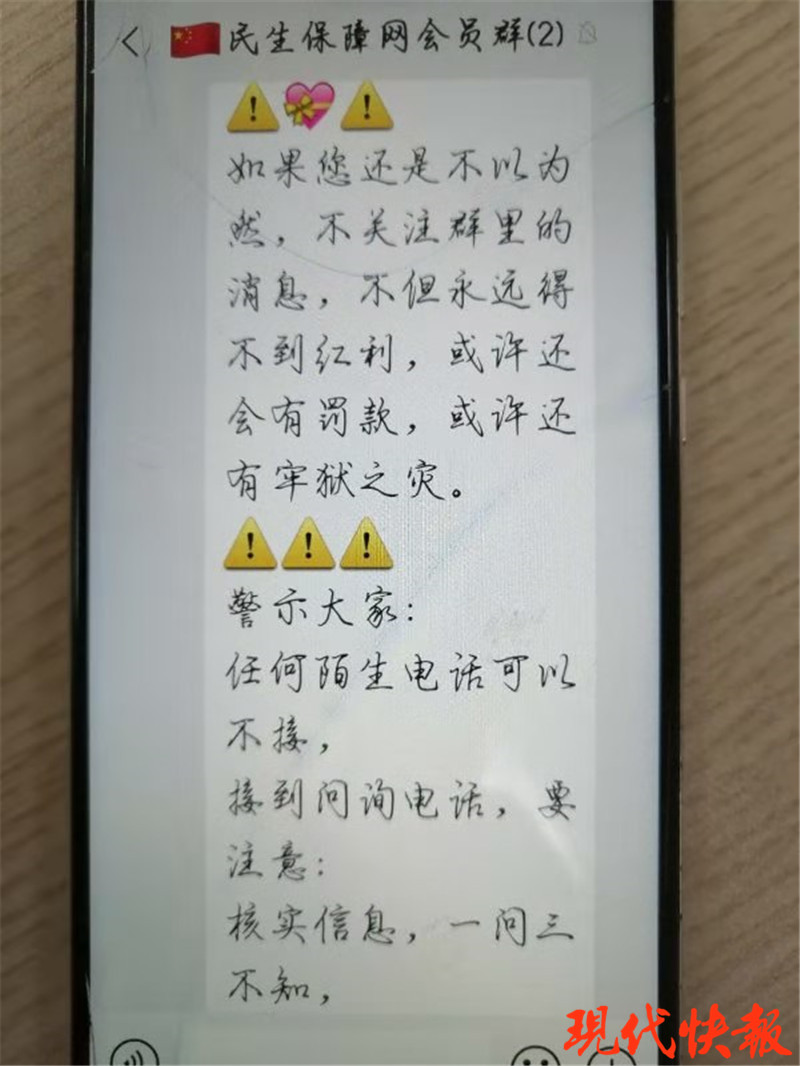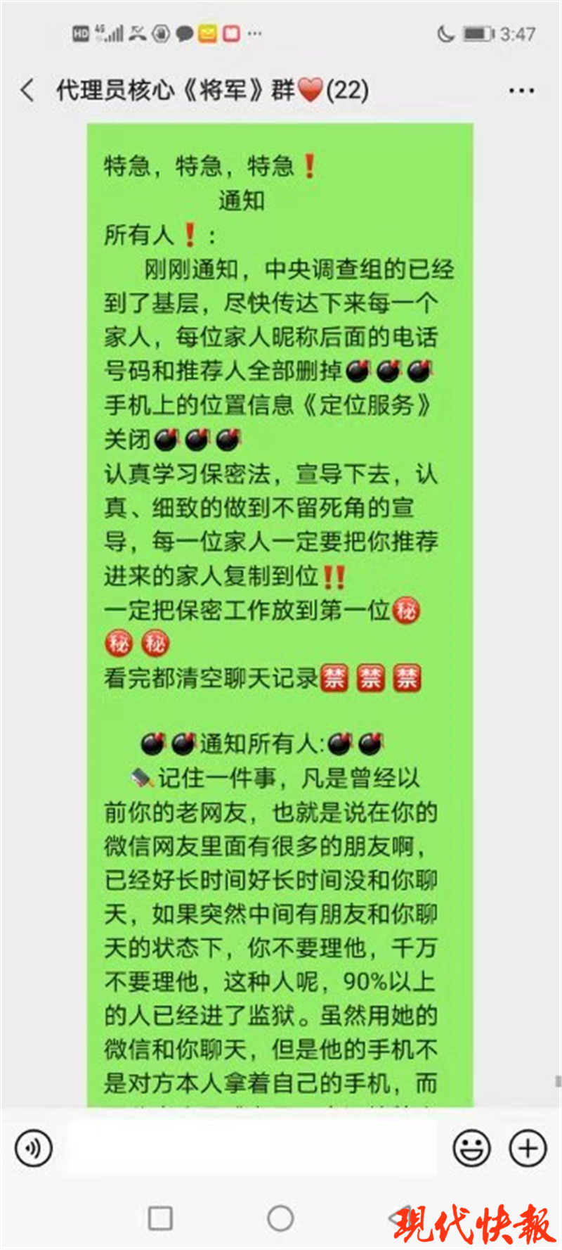 辦案民警介紹,該犯罪團(tuán)伙假借國(guó)家政策和社會(huì)熱點(diǎn),宣稱(chēng)“民生保障網(wǎng)”為國(guó)家精準(zhǔn)扶貧項(xiàng)目,只要繳納3400元的“入網(wǎng)費(fèi)”后便可成為會(huì)員,享受債務(wù)清零、征信洗白和高額返利等“國(guó)家福利”。他們利用互聯(lián)網(wǎng)社交工具,在微信群內(nèi)傳發(fā)所謂“中央文件”“領(lǐng)導(dǎo)講話(huà)”“官方新聞”,對(duì)團(tuán)伙成員進(jìn)行傳銷(xiāo)式“洗腦”,以小投入獲得大回報(bào)為誘餌實(shí)施犯罪,在短短4個(gè)月內(nèi)已發(fā)展成一個(gè)人數(shù)眾多、層級(jí)分明的跨省市犯罪團(tuán)伙,各層級(jí)均有相應(yīng)的代理商、統(tǒng)計(jì)員、講師及收款員等角色。經(jīng)查證,該案中的“民生保障網(wǎng)”項(xiàng)目確為公安部公布的“人際網(wǎng)”項(xiàng)目“改頭換面”的產(chǎn)物。